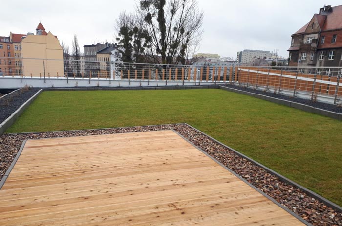 Einbau von Gründachschichten aus Drainage-, Schutz- und Filterschichten sowie Substrat.